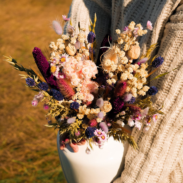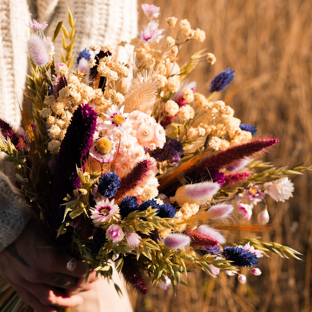 Chardon blanc, phalaris violet, pavot, lagurus violet, statice violet, babala violet, immortelle rose, orge orange, sétaire rose, avoine nature, rhodante rose, achillea blanc